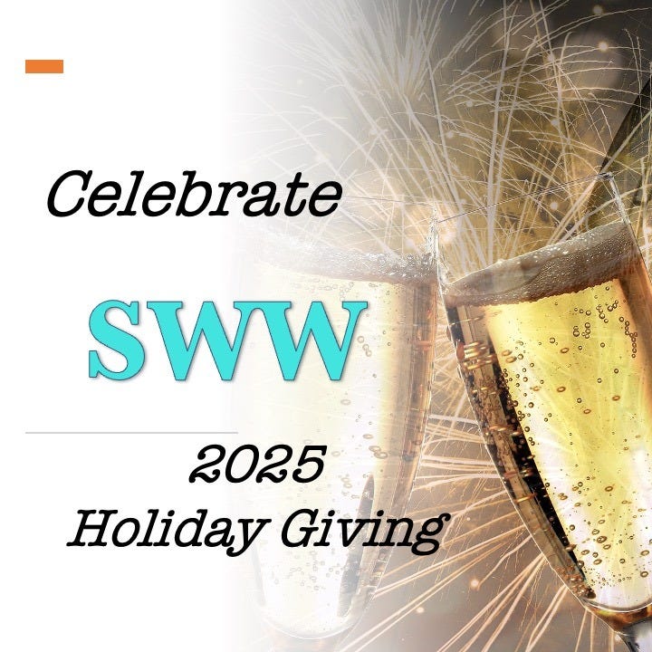 Like most non-profits this time of year, we are asking you to consider donating to SWW’s 2025 Holiday Giving Campaign—Celebrate SWW—as part of your end of the year tax deductible donations. Your donation to SWW (a nonprofit, tax exempt 501 (c)(3) organization) allows us to continue to provide the information and encouragement authors are seeking.